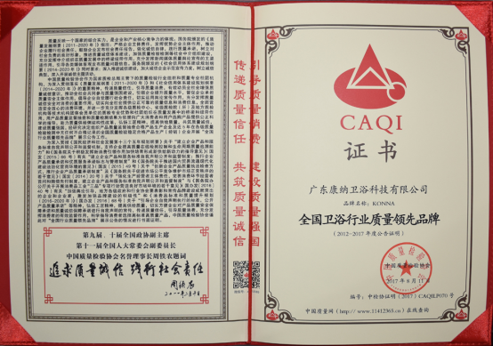 2017年,继荣获“质量创新奖”、“中国科技创新绿色环保行业十佳知名品牌”等殊荣之后,近日,康纳卫浴又蝉联中国质量检验协会颁发的“全国卫浴行业质量领先品牌”,并获得 “全国质检稳定合格产品”专用标识。成绩斐然,是业界对康纳卫浴的高度认可!