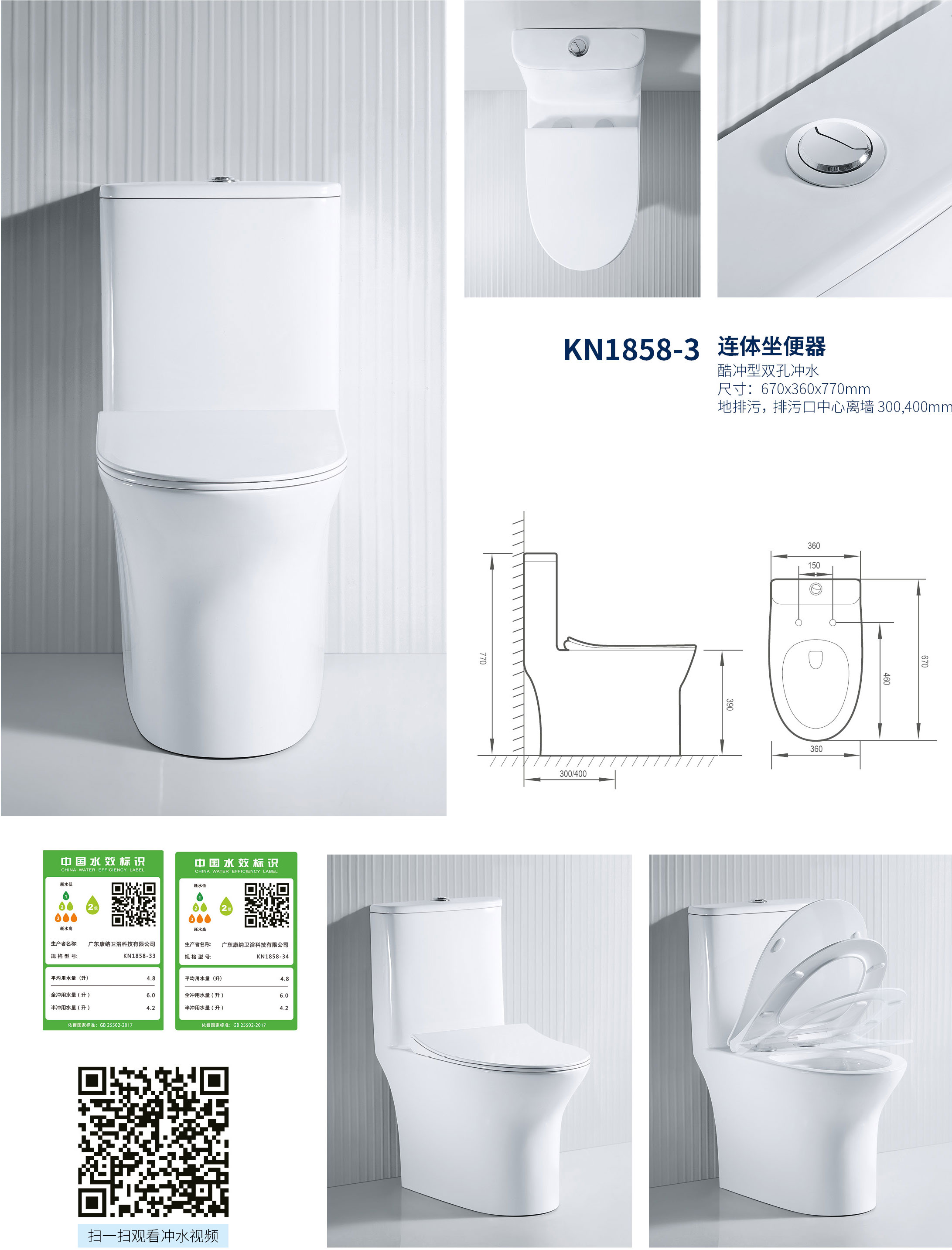 ●.该产品为酷冲型双孔坐便器,大排污口径,不易堵塞,排污更顺畅;排污管内壁全面施釉,不易挂污,5cm以上国家标准水封,能够有效防止溅水,隔臭、防噪音。